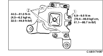4. Place the battery tray bracket on the No.4 engine mount rubber with body stud bolts passing through the holes and tighten bolts and nuts in the order as shown in the figure.