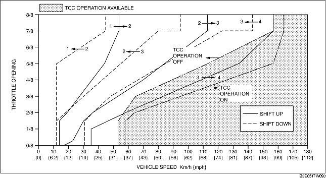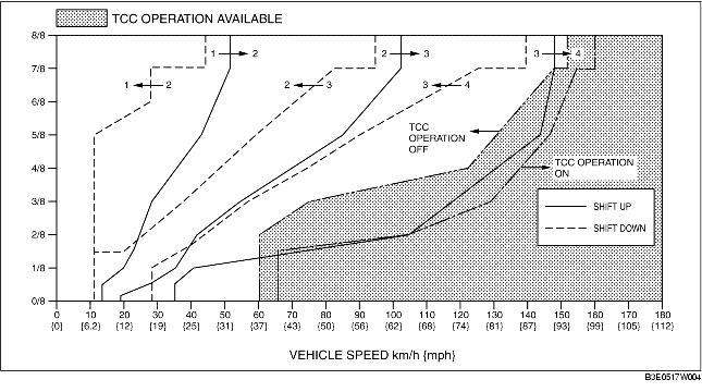 7. Drive the vehicle and verify that TCC operation is obtained. The operation points must be as shown in the table below.