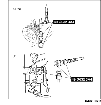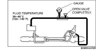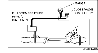 5. Start the engine, turn the steering wheel to the left and right to raise the power steering fluid to the appropriate temperature (50-60 °C {122-140 °F}).
