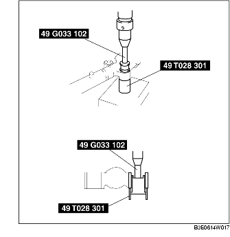 3. Press the mounting rubber until the mounting rubber end comes out completely from the gear housing using the SSTs and a press.
