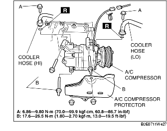 8. Disconnect the cooler hose (LO) and cooler hose (HI). Do not allow remaining compressor oil in the refrigerant line to spill. (See Refrigerant Line Removal Note.) (See Refrigerant Line Installation Note.)