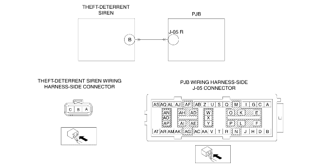 • Inspect the theft-deterrent siren connector terminals for poor connection (such as damaged/pulled-out pins, and corrosion).