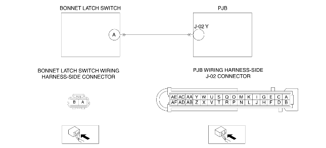 • Inspect for continuity between PJB terminal J-02 Y (wiring harness-side) and bonnet latch switch terminal A (wiring harness-side).