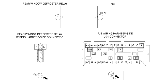 • Inspect for continuity between PJB terminal J-01 AH (wiring harness-side) and rear window defroster relay terminal E (wiring harness-side).