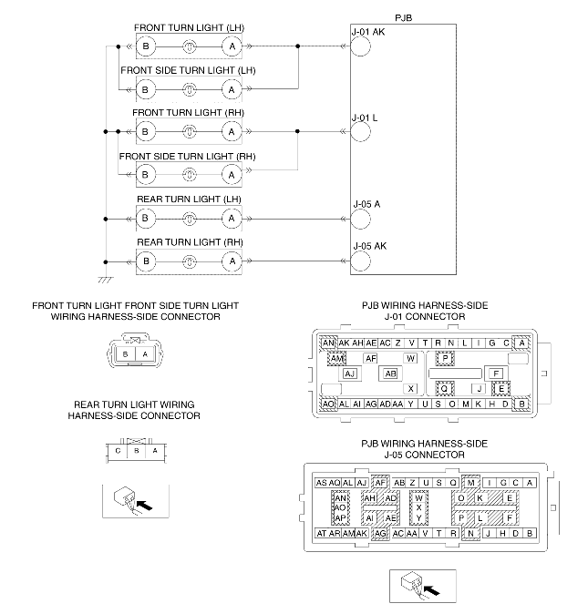 • Inspect the PJB connector terminals for poor connection (such as damaged/pulled-out pins, and corrosion).