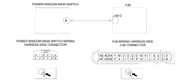 • Inspect for continuity between PJB terminal J-06 O (wiring harness-side) and power window main switch terminal B (wiring harness-side).