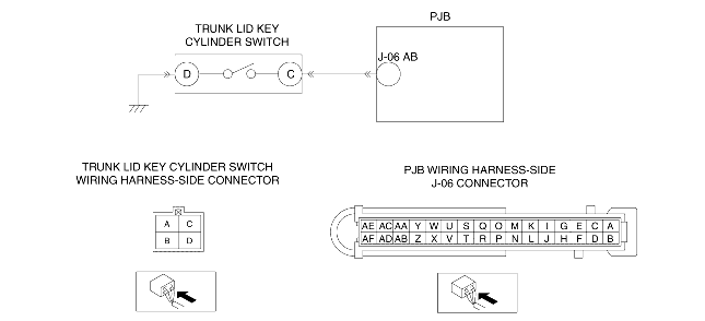 • Inspect the trunk lid key cylinder switch connector terminals for poor connection (such as damaged/pulled-out pins, and corrosion).