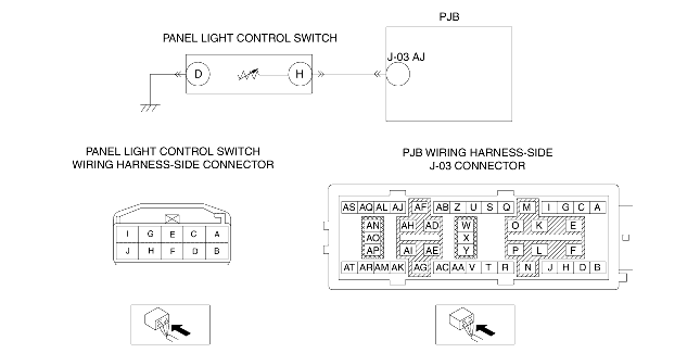 • Inspect for continuity between PJB terminal J-03 AJ (wiring harness-side) and panel light control switch terminal H (wiring harness-side).
