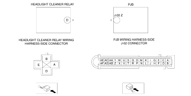 • Inspect for continuity between PJB terminal J-02 Z (wiring harness-side) and headlight cleaner relay terminal D (wiring harness-side).