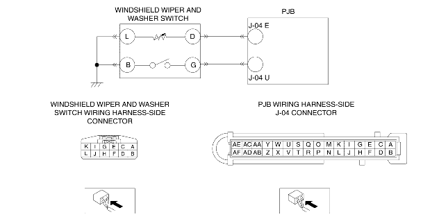 • Inspect for continuity between PJB terminal J-04 U (wiring harness-side) and windshield wiper and washer switch terminal G (wiring harness-side).