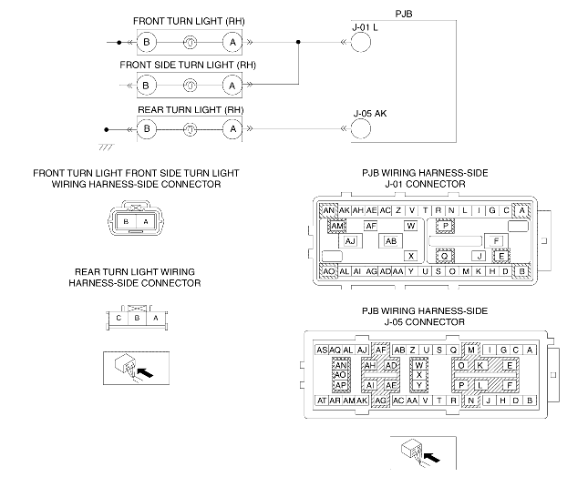 • Inspect all the turn light (RH) connector terminals for poor connection (such as damaged/pulled-out pins, and corrosion).