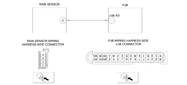 • Inspect for continuity between PJB terminal J-06 AD (wiring harness-side) and rain sensor terminal C (wiring harness-side).