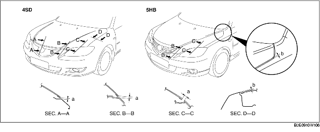 4. Verify that the gap between the bonnet and the body is within the specification.