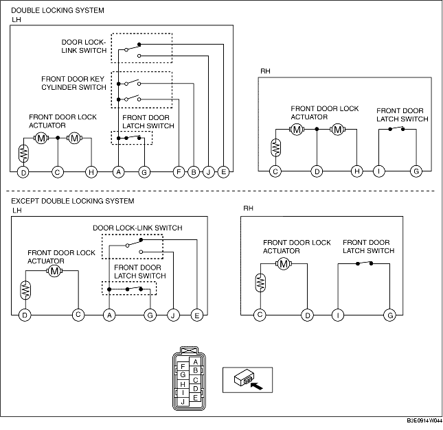 1. The following actuators and switches are integrated with the front door latch and lock actuator. Inspect the front door latch and lock actuator according to each inspection procedure for the following items.