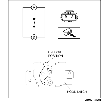 6. Inspect for continuity between the bonnet latch switch terminals A and B