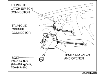 5. Remove the bolts, then remove the trunk lid latch and opener.
