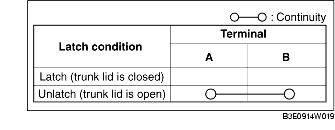2. Inspect for continuity between the trunk lid latch switch terminals.