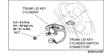 5. Remove the nuts, then remove the trunk lid key cylinder.