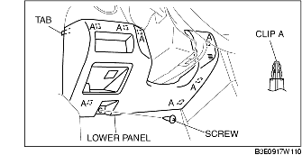 2. Detach the bonnet release lever from the lower panel. (SeeBONNET LATCH AND RELEASE LEVER REMOVAL/INSTALLATION [L.H.D.].) (SeeBONNET LATCH AND RELEASE LEVER REMOVAL/INSTALLATION [R.H.D.].)