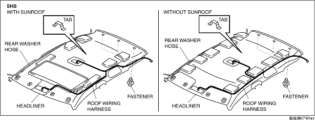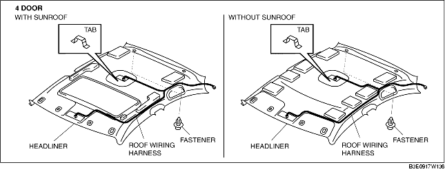 4. Disconnect the roof wiring harness connector and remove the roof wiring harness connector clip from the body.