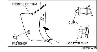 3. Pull the front side trim in the direction of the arrow and detach clip A and locator pin B.