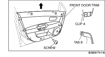 7. Pull the front door trim upward and detach tabs B from the front door.