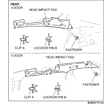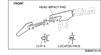 3. Pull the head impact pad outward and detach the clips A and the locator pins B.