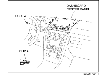 4. Pull the dashboard center panel outward and detach clips A and locator pins B.