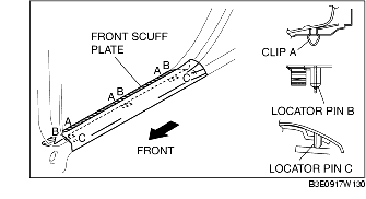 1. Pull the front scuff plate upward, detach clips A, locator pins B and C from the body, and then remove the front scuff plate.