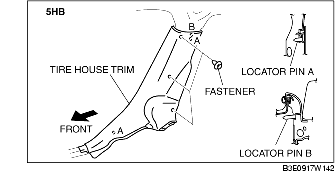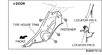 4. Pull the tire house trim outward and detach locator pins A and B.