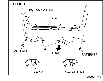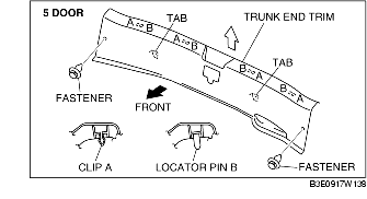 2. Pull the trunk end trim upward, then detach clips A, locator pins B and tabs.