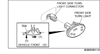 3. Pull area A of the front side turn light in the direction of the arrow (2) and remove the front side turn light.