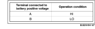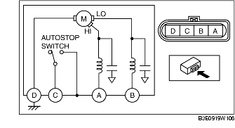 2. Connect battery positive voltage to windshield wiper motor terminal A or B, and ground to terminal D, then verify that the windshield wipers operate as shown in the table.