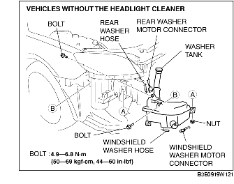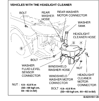 4. Disconnect the headlight cleaner motor connector and headlight cleaner hose. (Vehicles with the headlight cleaner)