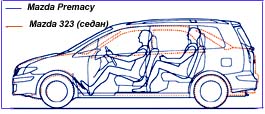 Контуры автомобилей Mazda Premacy и Mazda 323 (седан). Оказывается, Mazda Premacy на 20 мм короче компактного седана, хотя с виду этого не скажешьЗвук мотора очень уж добросовестно информирует о режимах его работы, и это уже перебор. Mazda Premacy — все же не спортивное купе, и потому потакать темпераментному водителю имеет смысл до определенного предела: остальным обитателям семейного универсала такой громкий мотор может и не понравиться... А вот аэродинамический шум и шум от колес — едва заметны. С одной стороны, Mazda Premacy прекрасно приспособлена для скоростной езды. Реакции быстрые и четкие, машина отлично ведет себя на прямой, в пологих и крутых поворотах.