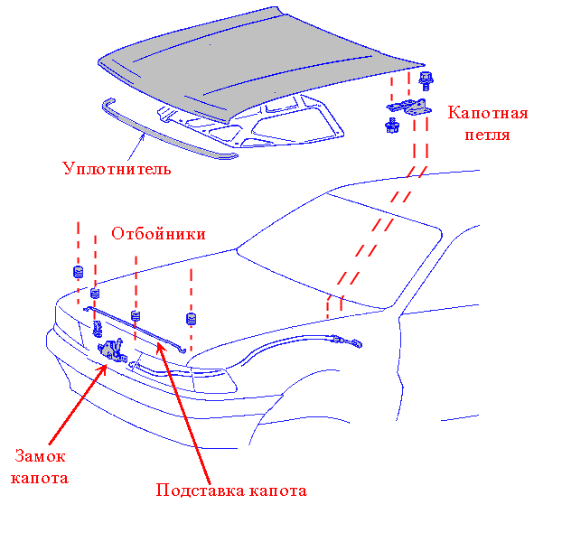 Не забудьте подкрасить петлю, т. к. место сырое, и очень скоро там можетобразоватьсякоррозия, ну и потом смазать маслом. Поставьте петлю на место. Проведите вышеописанную операцию со второй петлей. Маленький совет, которым собираюсь воспользоваться сам в ближайшее время, поставить уплотнитель под капот. Его можно увидеть на Рисунке 1. В роли уплотнителя можно использовать уплотнитель от двери ВАЗ-2106 (наклеить можно, например, на 2-х сторонний скотч). Данный пример я увидел у одного водителя на Галанте Е32, как результат модернизации, отсутствие грязи на капоте и на двигателе, но по крайней мере ее попадает меньше :-). Удачи всем |
