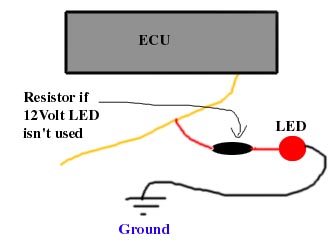 Tap off of wire 105 (orange) with either a 12volt internal resistor LED (available at some Radio Shacks) or use a regular LED with a 470 ohm resistor in series (Do not use regular indicator light bulbs). You must have either the boost control solenoid installed even if you're not using it or solder a 40 ohm resistor in it's place. Whatever you do don't just short the 2 wires together or you can damage the ECU. The LED will not work without either the resistor or boost control solenoid installed.