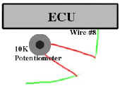 Solder up some wire leads to a 10k potentiometer using the last 2 terminals so that when the dial is turned as far as it can go counterclockwise you have 0 ohms resistance. Cut wire 8 and solder the potentiometer in series. It doesn't matter which side of the potentiometer goes to which wire. You should start tuning the car with the knob turned fully counterclockwise (the ecu will see the real air temperature). By turning the knob clockwise the ecu will think that the air is cooler and will add fuel to accommodate the denser air. Do not try and tune without monitoring the O2 sensor with a voltmeter. Tune until you get .88-.92 at wide open throttle. You will only be able to adjust full throttle A/F ratio with this mod. It won't do anything for the lower rpms. Don't adjust this unless you've done some mods to require more fuel. (Mass air flow sensor hacking......etc) If you're running lean without having done mods then check the intake piping between the turbo and mass air flow sensor.