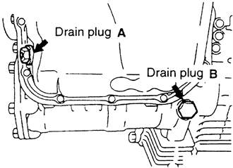 | Fig. 2: The 1995–98 2.0L turbo and 2.4L engine have 2 drain plugs |