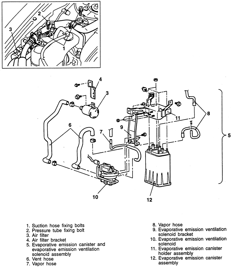 | Fig. 1: Location of the evaporative emission canister and related components — 1990–94 2.0L engine shown |