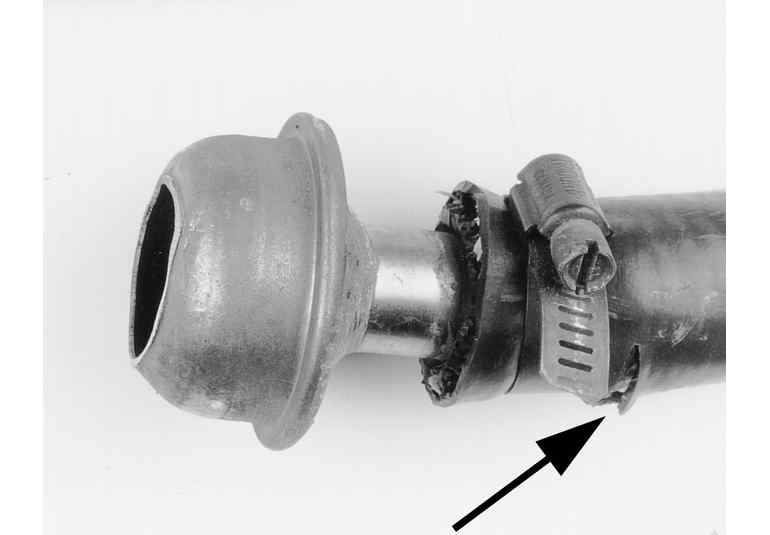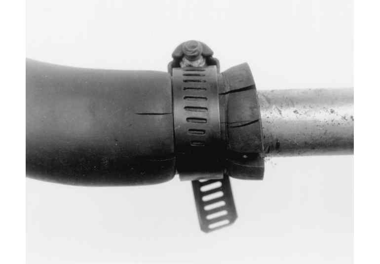 | Fig. 2: A hose clamp that is too tight can cause older hoses to separate and tear on either side of the clamp |