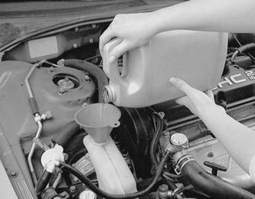 Check the coolant level every 3,000 miles or once a month. In hot weather operation, it may be a good idea to check the level once a week. Check for loose connections and signs of deterioration of the coolant hoses. Check the coolant level in the reservoir when the engine is cold, making sure the level is at the FULL or MAX mark. If the bottle is empty, check the level in the radiator and refill as necessary. Then fill the bottle up to the FULL or MAX level.