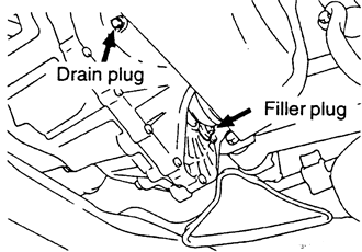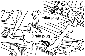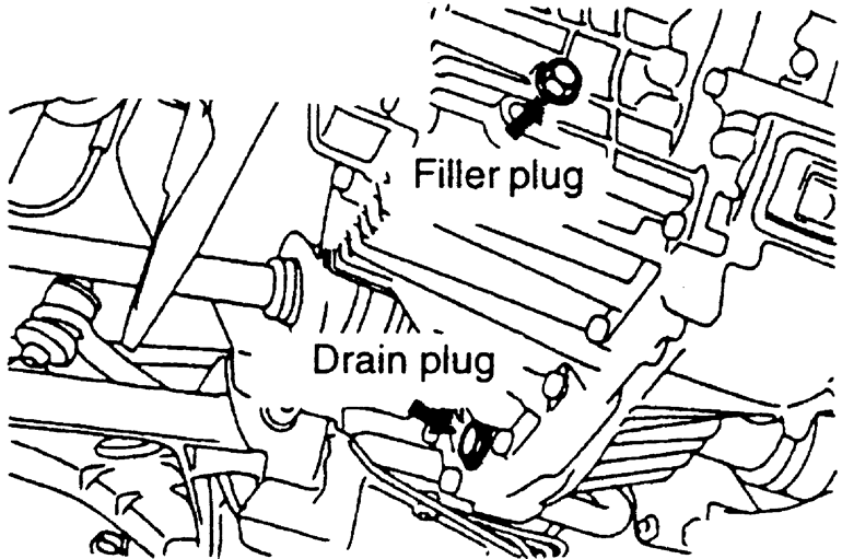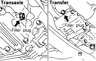 | Fig. 1: Manual transaxle and transfer filler plugs — 1990–94 vehicles |