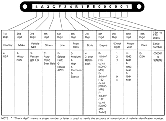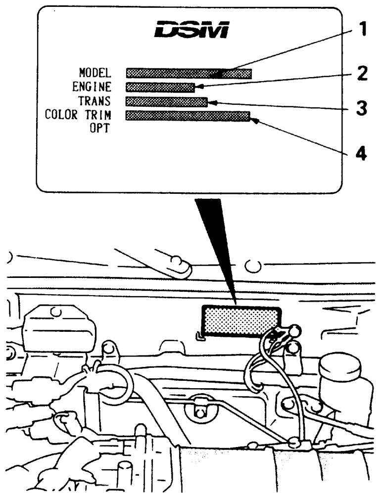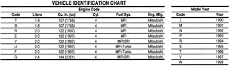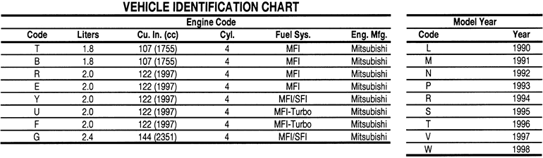 There is also a vehicle information code plate which is riveted to the bulkhead in the engine compartment. The plate shows the VIN, model code, engine model, transaxle model and body color codes. The engine code used on this plate differs from the code letter used in the 8th position of the Vehicle Identification Number (VIN). Either code can be used to identify the particular engine in the vehicle. Since the vehicle owners card is usually carried, it may be easier to use the code letter in the VIN for engine reference. A second reason for referring to the VIN for engine identification is that code 4G63, located on the vehicle information code plate, does identify the engine as a 2.0L DOHC engine, but does not tell you if the engine is equipped with a turbocharger. If the 8th VIN number is a U, there is no doubt that the engine in question is a 2.0L DOHC engine equipped with a turbocharger.