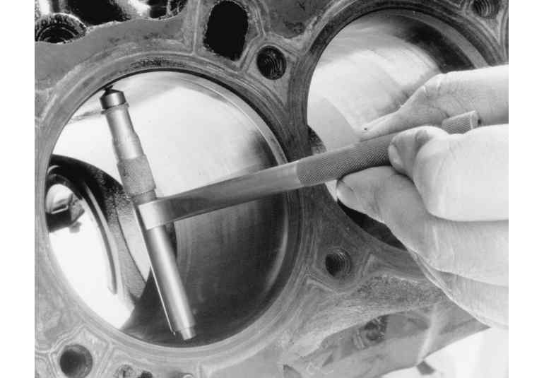 The cylinder bores house the pistons and are slightly larger than the pistons themselves. A common piston-to-bore clearance is 0.0015–0.0025 in. (0.0381mm–0.0635mm). Inspect and measure the cylinder bores. The bore should be checked for out-of-roundness, taper and size. The results of this inspection will determine whether the cylinder can be used in its existing size and condition, or a rebore to the next oversize is required (or in the case of removable sleeves, have replacements installed). Use a telescoping gauge to measure the cylinder bore diameter — take several readings within the same bore