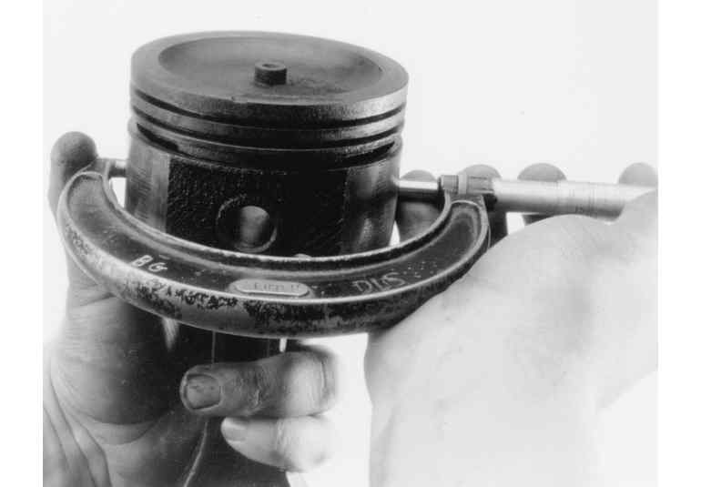 Use a micrometer and measure the diameter of the piston, perpendicular to the wrist pin, on the skirt. Compare the reading to its original cylinder measurement obtained earlier. The difference between the two readings is the piston-to-wall clearance. If the clearance is within specifications, the piston may be used as is. If the piston is out of specification, but the bore is not, you will need a new piston. If both are out of specification, you will need the cylinder rebored and oversize pistons installed. Generally if two or more pistons/bores are out of specification, it is best to rebore the entire block and purchase a complete set of oversize pistons.