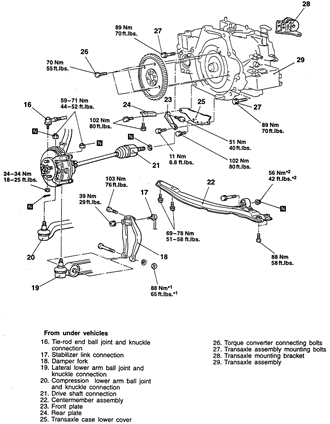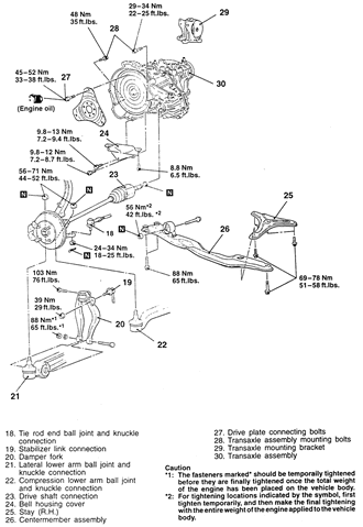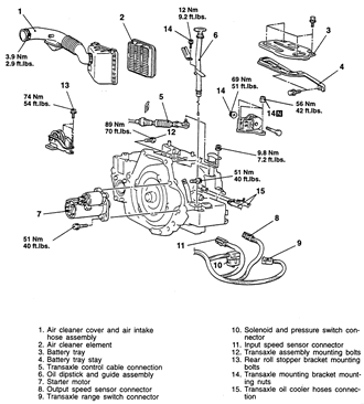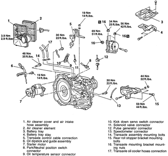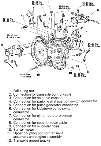| Fig. 7: Automatic transaxle and related components (page 1 of 2) — 1995–98 2.4L engine shown |