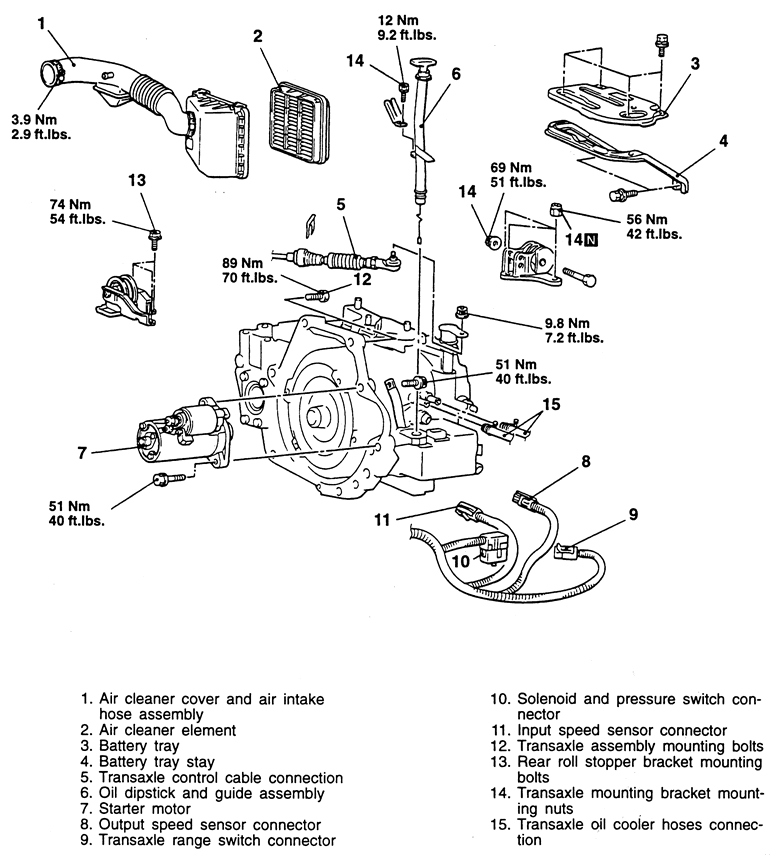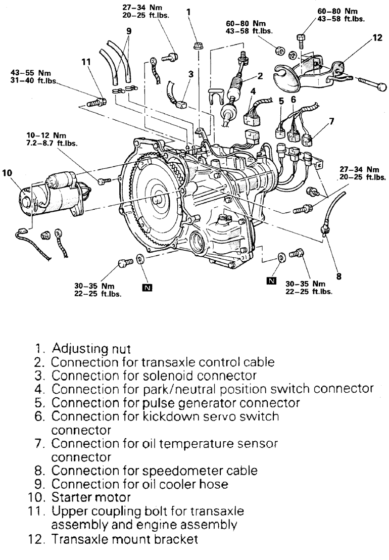 | Fig. 8: Automatic transaxle and related components (page 2 of 2) — 1995–98 2.4L engine shown |