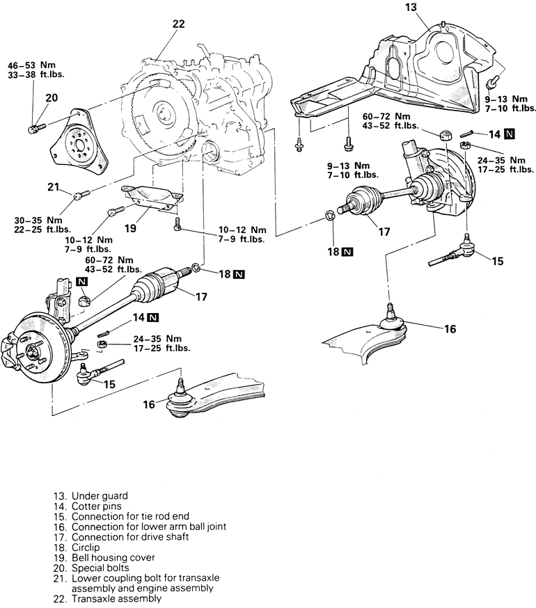 | Fig. 6: Exploded view of transaxle removal (page 2 of 2) — 1995–98 2.0L turbo engines, FWD shown, AWD similar |