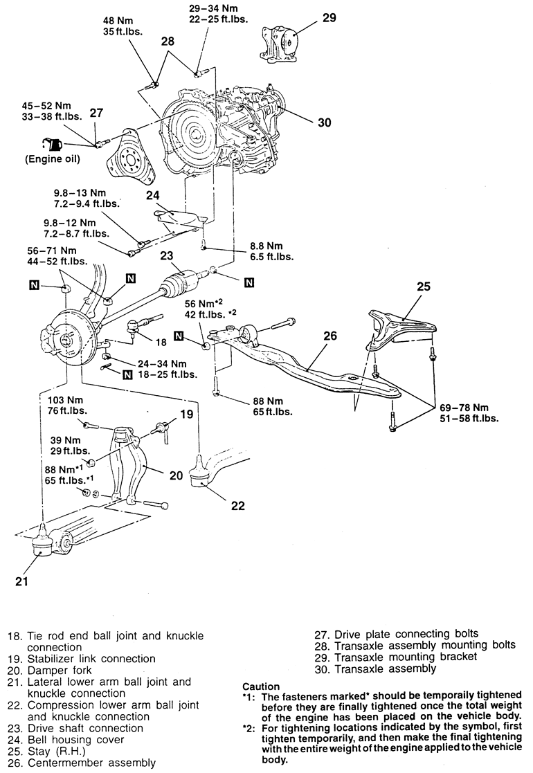 | Fig. 3: Automatic transaxle and related components (page 1 of 2) — 1995–98 2.0L non-turbo engines |
